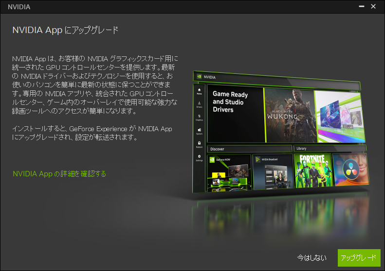 - 表示された案内に沿って NVIDIA App にアップグレード