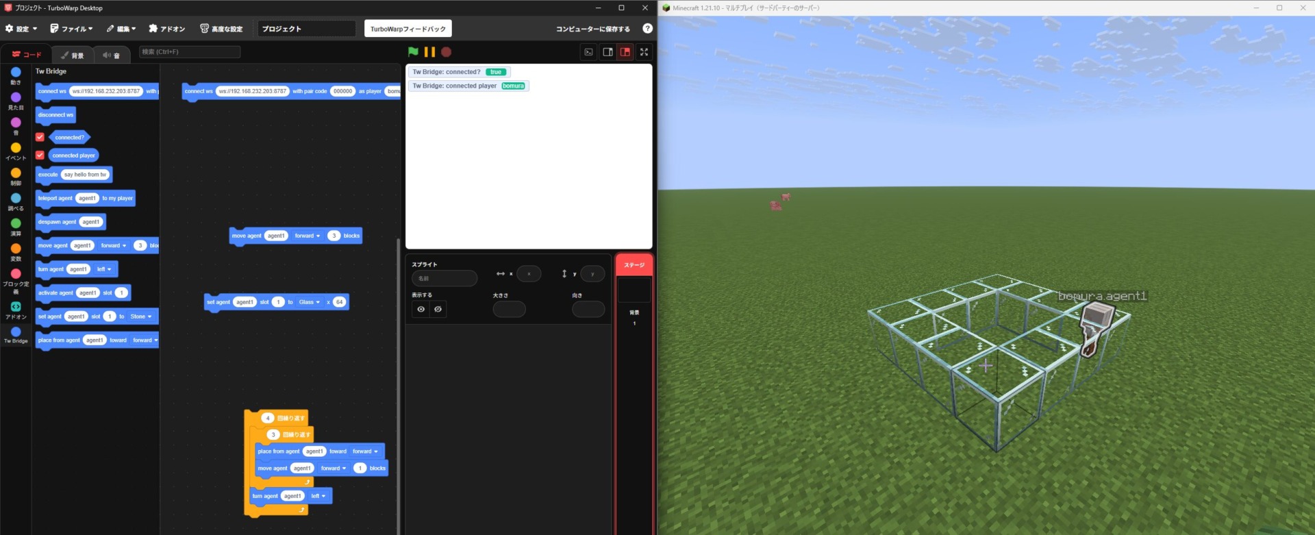 今回はその続きとして、twbridgeプラグインでエージェントを操作し、ブロック設置に対応した話と、そこに至るまでの試行錯誤をまとめます。